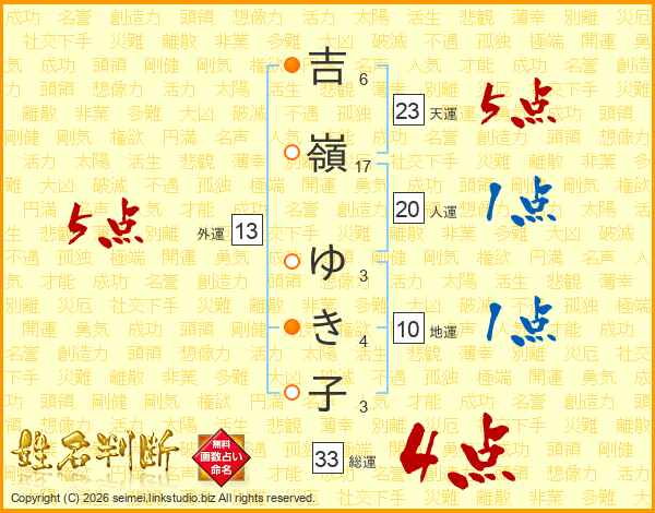 吉(6画)嶺(17画) ゆ(3画)き(4画)子(3画)