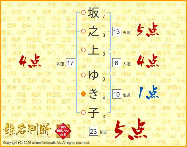 坂之上ゆき子さんの天運は13画の5点!
