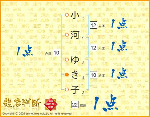 小河ゆき子さんの総運は22画の1点!