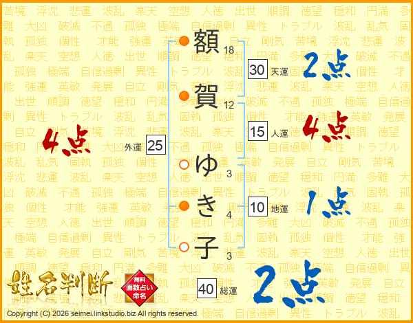 額(18画)賀(12画) ゆ(3画)き(4画)子(3画)