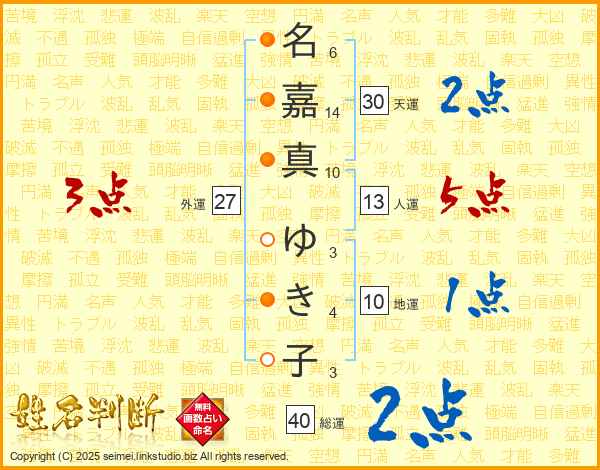 名(6画)嘉(14画)真(10画) ゆ(3画)き(4画)子(3画)
