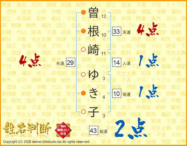 曽(12画)根(10画)崎(11画) ゆ(3画)き(4画)子(3画)