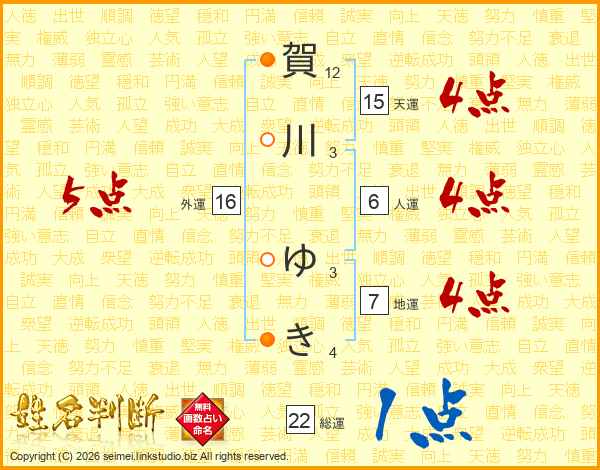 賀(12画)川(3画) ゆ(3画)き(4画)