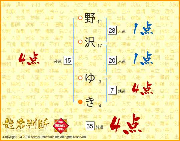 野(11画)沢(17画) ゆ(3画)き(4画)