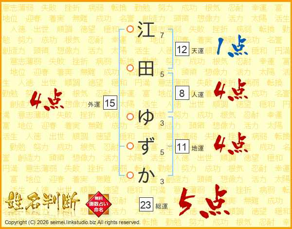 江(7画)田(5画) ゆ(3画)ず(5画)か(3画)