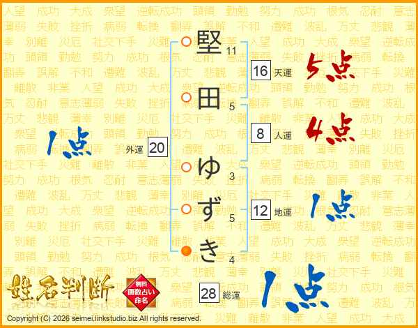 堅(11画)田(5画) ゆ(3画)ず(5画)き(4画)