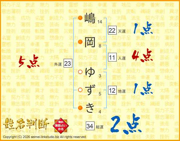嶋(14画)岡(8画) ゆ(3画)ず(5画)き(4画)