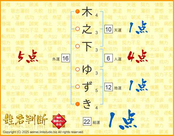 木(4画)之(3画)下(3画) ゆ(3画)ず(5画)き(4画)
