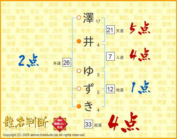 澤(17画)井(4画) ゆ(3画)ず(5画)き(4画)