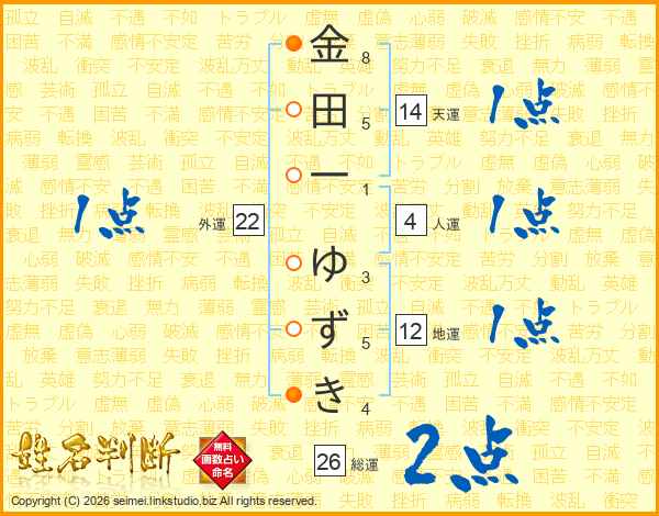 金(8画)田(5画)一(1画) ゆ(3画)ず(5画)き(4画)