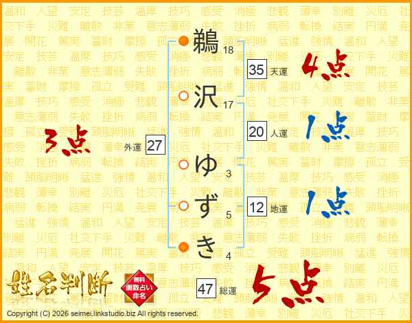 鵜(18画)沢(17画) ゆ(3画)ず(5画)き(4画)