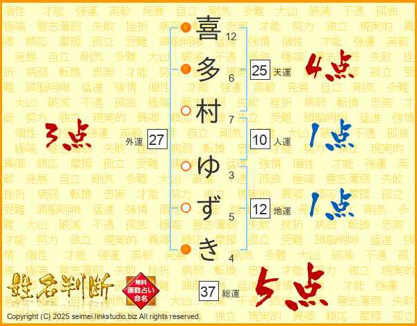喜(12画)多(6画)村(7画) ゆ(3画)ず(5画)き(4画)