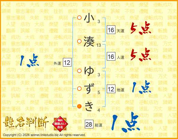 小(3画)湊(13画) ゆ(3画)ず(5画)き(4画)