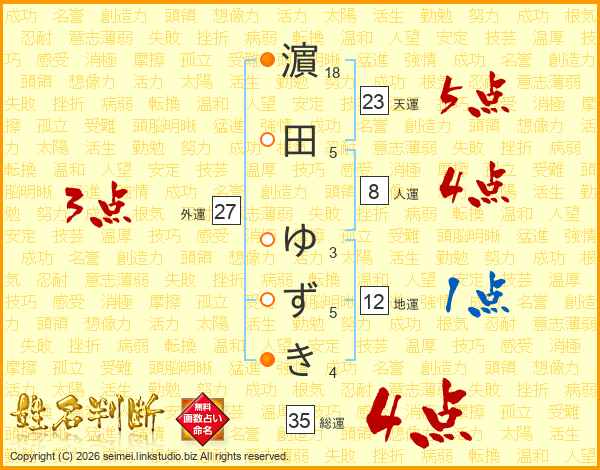 濵(18画)田(5画) ゆ(3画)ず(5画)き(4画)