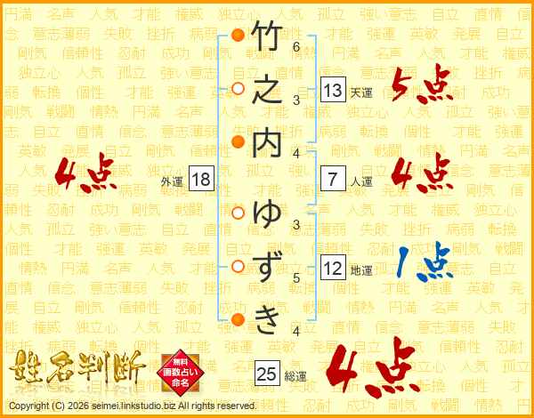 竹之内ゆずきさんの総運は25画の4点!