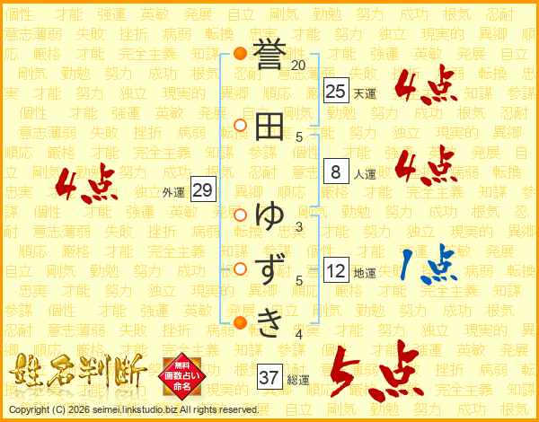 誉田ゆずきさんの総運は37画の5点!