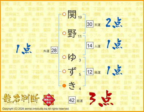 関(19画)野(11画) ゆ(3画)ず(5画)き(4画)