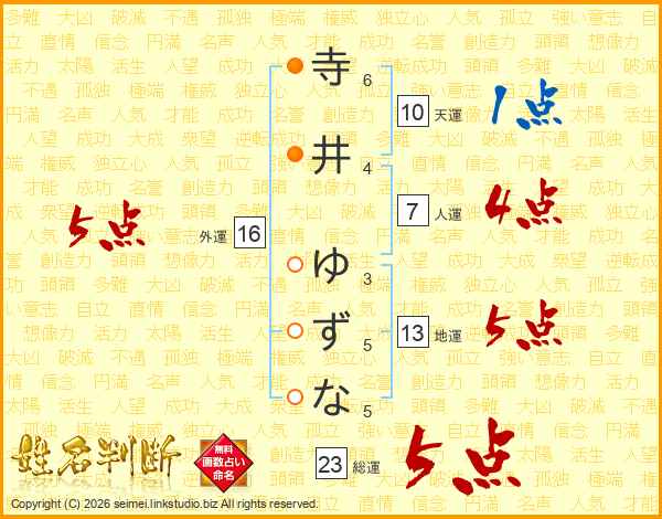 生活面を象徴する運勢です。外部から受ける影響力を表し、結婚運、家庭運や職場、環境への順応性を表します。総運から人運を引いた画数。姓や名が1文字の場合を除く。