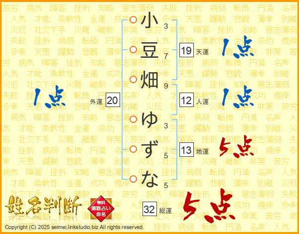 小(3画)豆(7画)畑(9画) ゆ(3画)ず(5画)な(5画)