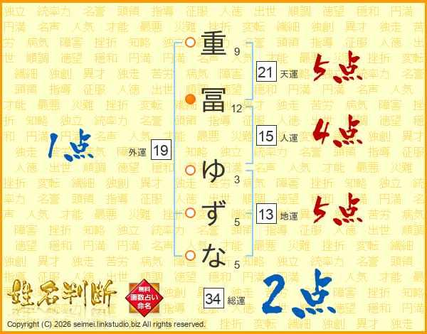 重(9画)冨(12画) ゆ(3画)ず(5画)な(5画)