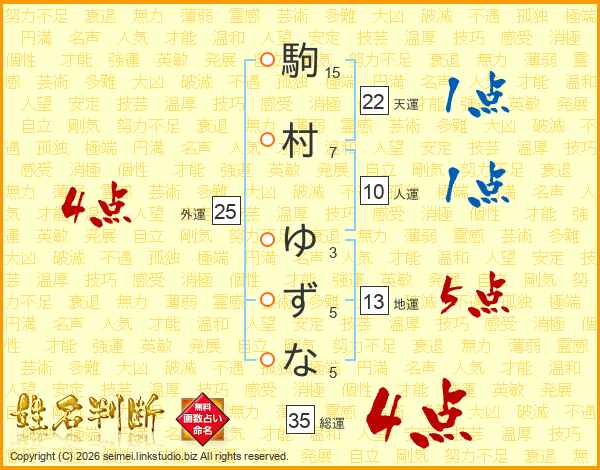 駒(15画)村(7画) ゆ(3画)ず(5画)な(5画)