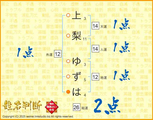 生活面を象徴する運勢です。外部から受ける影響力を表し、結婚運、家庭運や職場、環境への順応性を表します。総運から人運を引いた画数。姓や名が1文字の場合を除く。