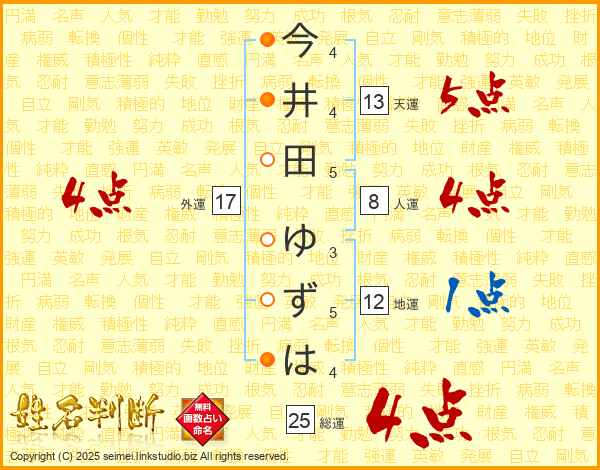 今(4画)井(4画)田(5画) ゆ(3画)ず(5画)は(4画)