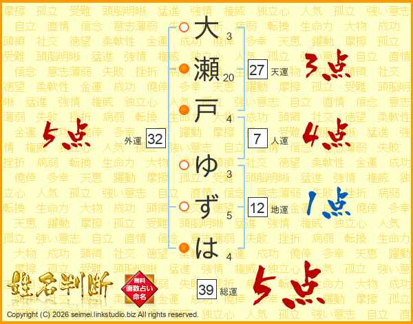 大(3画)瀬(20画)戸(4画) ゆ(3画)ず(5画)は(4画)