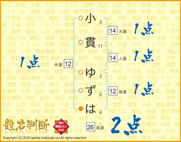 小(3画)貫(11画) ゆ(3画)ず(5画)は(4画)