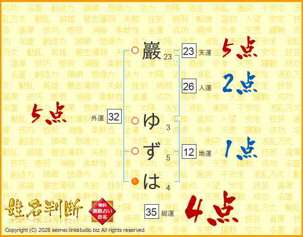 巖(23画) ゆ(3画)ず(5画)は(4画)