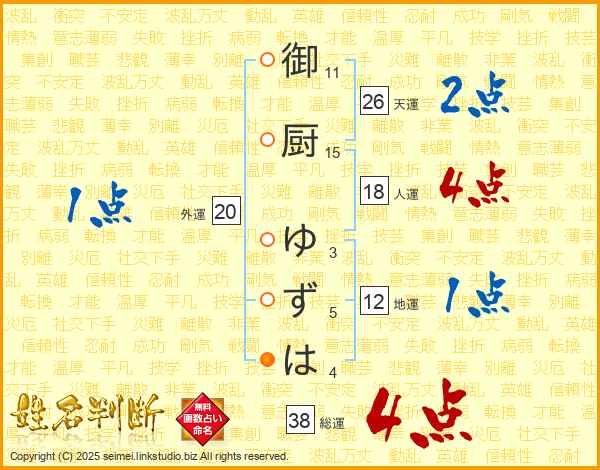 生活面を象徴する運勢です。外部から受ける影響力を表し、結婚運、家庭運や職場、環境への順応性を表します。総運から人運を引いた画数。姓や名が1文字の場合を除く。