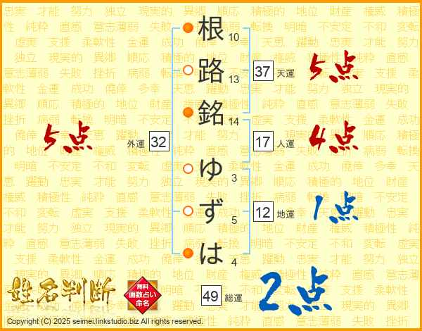 根(10画)路(13画)銘(14画) ゆ(3画)ず(5画)は(4画)