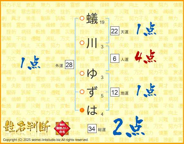 生活面を象徴する運勢です。外部から受ける影響力を表し、結婚運、家庭運や職場、環境への順応性を表します。総運から人運を引いた画数。姓や名が1文字の場合を除く。