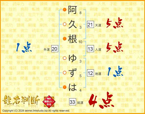 阿(8画)久(3画)根(10画) ゆ(3画)ず(5画)は(4画)