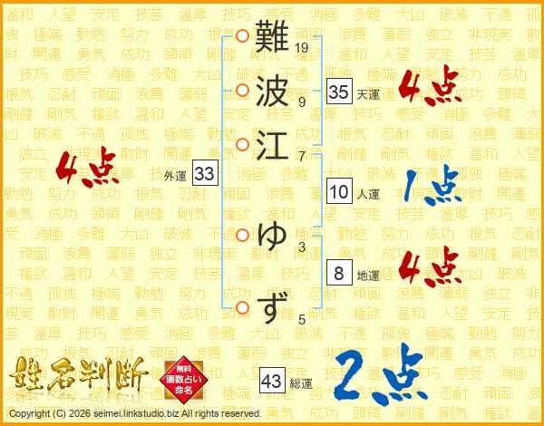 難(19画)波(9画)江(7画) ゆ(3画)ず(5画)