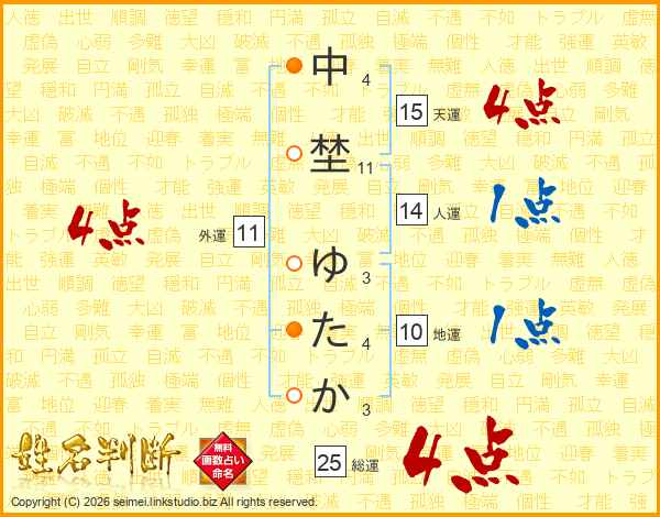 中(4画)埜(11画) ゆ(3画)た(4画)か(3画)