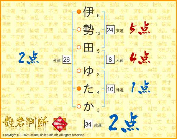 伊勢田ゆたかさんの総運は34画の2点!