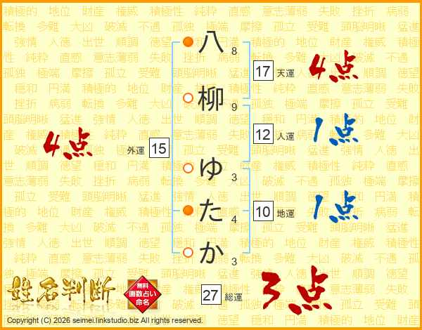 八柳ゆたかさんの総運は27画の3点!