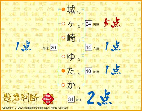 城ヶ崎ゆたかさんの総運は34画の2点!