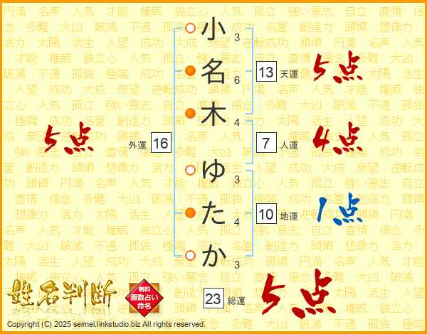 小(3画)名(6画)木(4画) ゆ(3画)た(4画)か(3画)