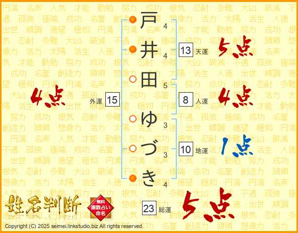 戸井田ゆづきさんの総運は23画の5点!