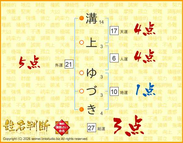 生活面を象徴する運勢です。外部から受ける影響力を表し、結婚運、家庭運や職場、環境への順応性を表します。総運から人運を引いた画数。姓や名が1文字の場合を除く。