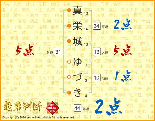 真(10画)栄(14画)城(10画) ゆ(3画)づ(3画)き(4画)