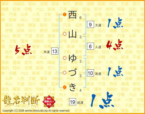 西(6画)山(3画) ゆ(3画)づ(3画)き(4画)