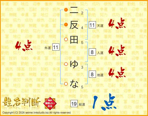 生活面を象徴する運勢です。外部から受ける影響力を表し、結婚運、家庭運や職場、環境への順応性を表します。総運から人運を引いた画数。姓や名が1文字の場合を除く。