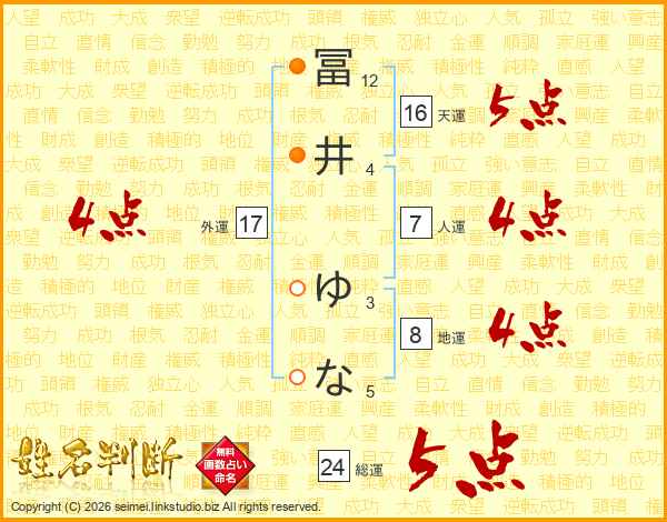 冨(12画)井(4画) ゆ(3画)な(5画)