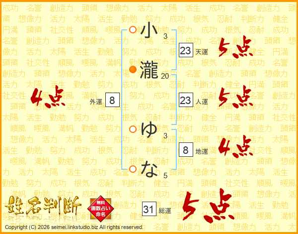 小(3画)瀧(20画) ゆ(3画)な(5画)