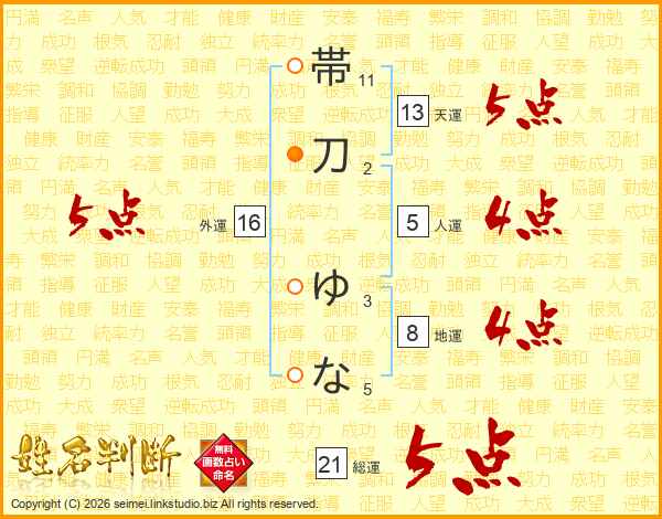 帯刀ゆなさんの総運は21画の5点!