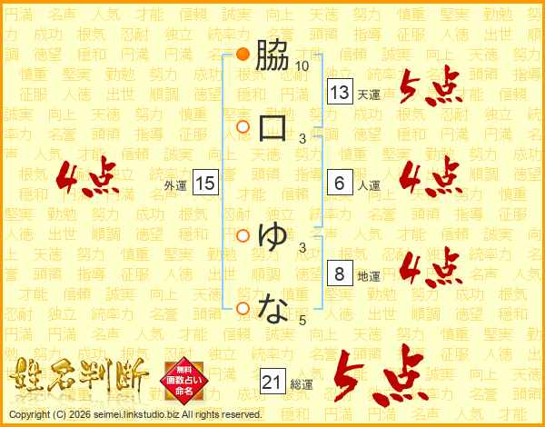 脇口ゆなさんの総運は21画の5点!