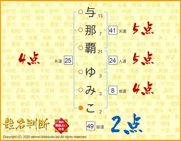 与(13画)那(7画)覇(21画) ゆ(3画)み(3画)こ(2画)